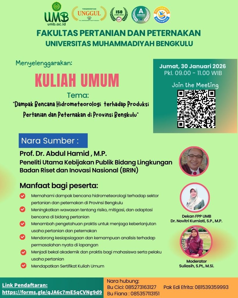 Fakultas Pertanian dan Peternakan (FPP) Universitas Muhammadiyah Bengkulu (UMB) menyelenggarakan Kuliah Umum bertema “Dampak Bencana Hidrometeorologi terhadap Produksi Pertanian dan Peternakan di Provinsi Bengkulu” pada Jumat, 30 Januari 2026. Kegiatan ini dilaksanakan secara daring melalui platform Zoom Meeting dan diikuti oleh mahasiswa, dosen, serta peserta dari kalangan akademisi dan praktisi di bidang pertanian dan peternakan.